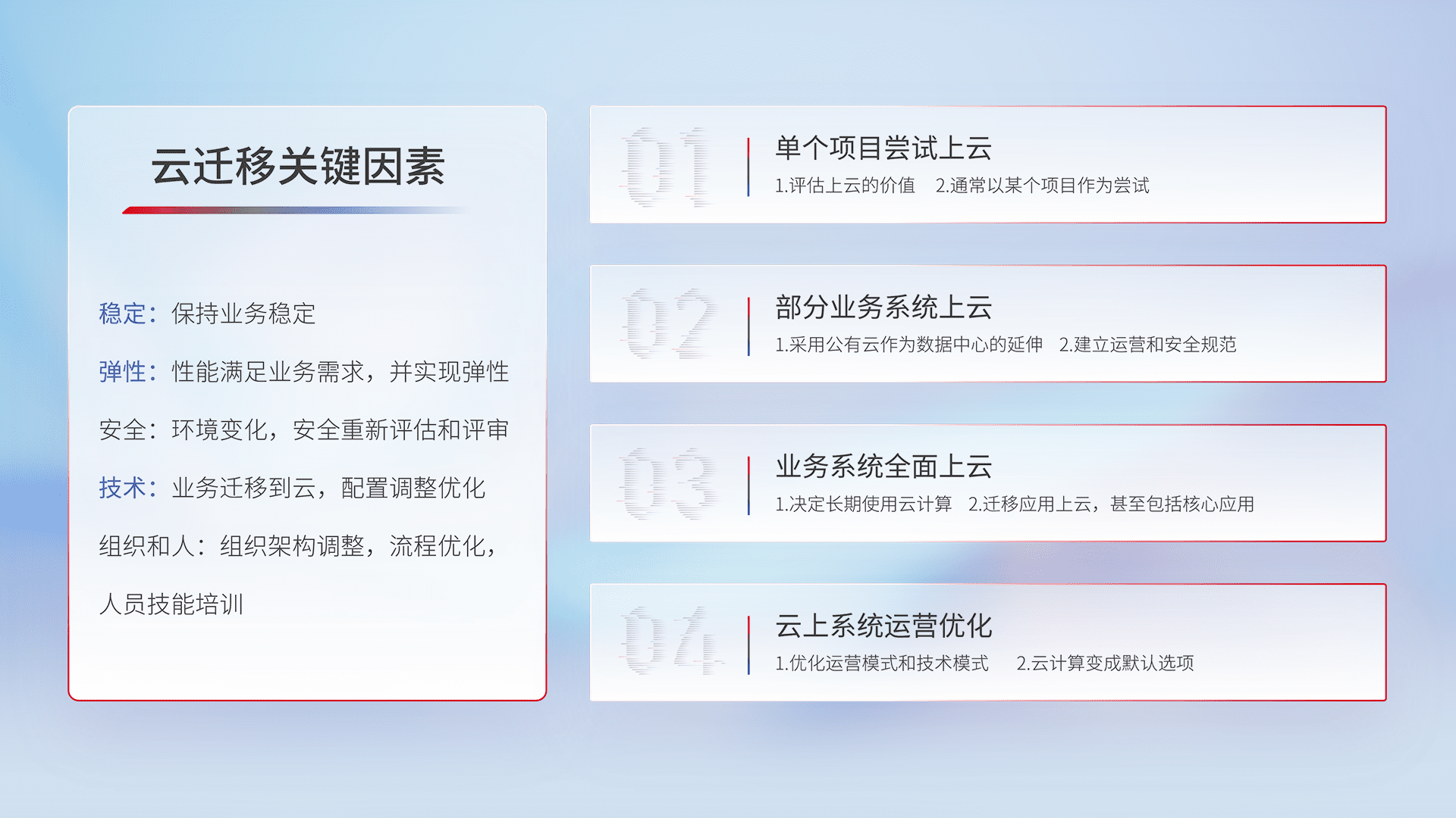 结合实际业务,,从规划设计、、、云平台选型、、、云原生改造、、数据迁移、、集成交付,,,迁移全过程为客户识别最佳上云路径,,,,做好风险识别管理,,设计网络架构、、、身份权限、、、、安全审计合规、、操作审计、、、、日志审计、、监控告警策略、、、多站点容灾设计等,,对云上基础设施进行整体规划,,,,提升IT治理水平,,,以满足弹性、、高可用、、、高性能的需求。。。